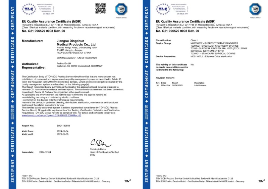 Dingshun Medical は現在、CE、MDR、FDA、ISO13485、ISO9001 を含む多くの国際認証を取得しています。